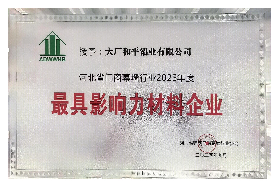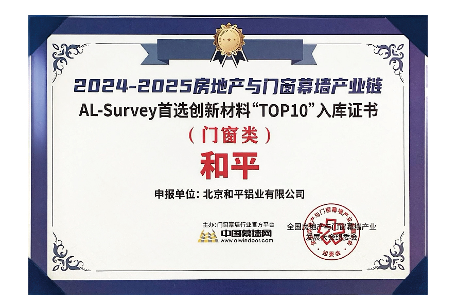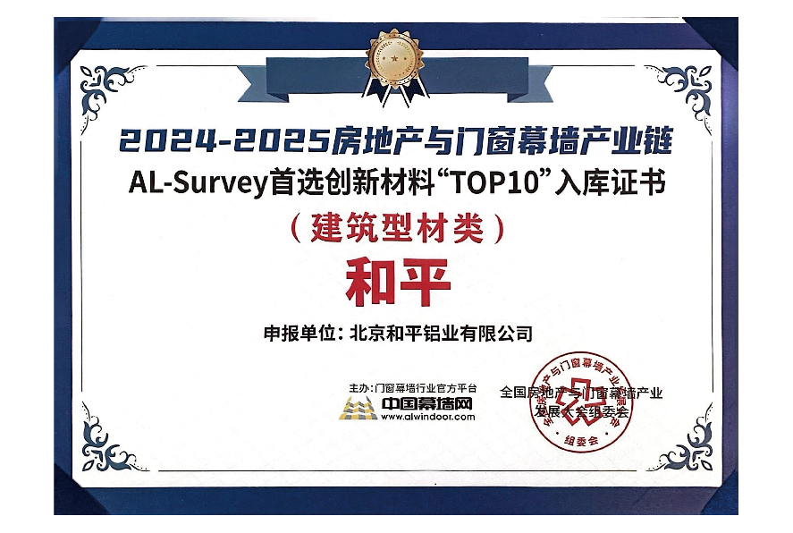 2024-2025房地产与门窗幕墙产业链首选创新材料“TOP10”入库证书(建筑型材类)
